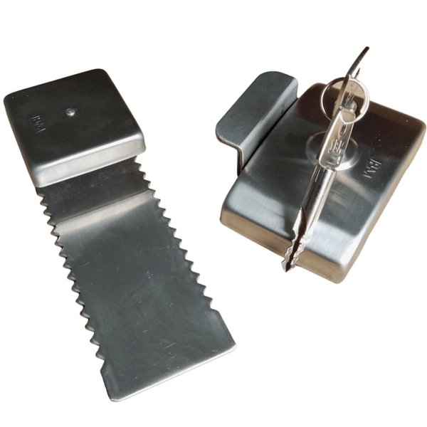 Trava de Segurança para porta de Vidro de Correr com chave tetra e lâmina de 15cm. Indicada para uso externo, pois possui travamento com chave. Alta segurança e fácil instalação, sendo necessário somente encaixar a lâmina no vidro para utilização.